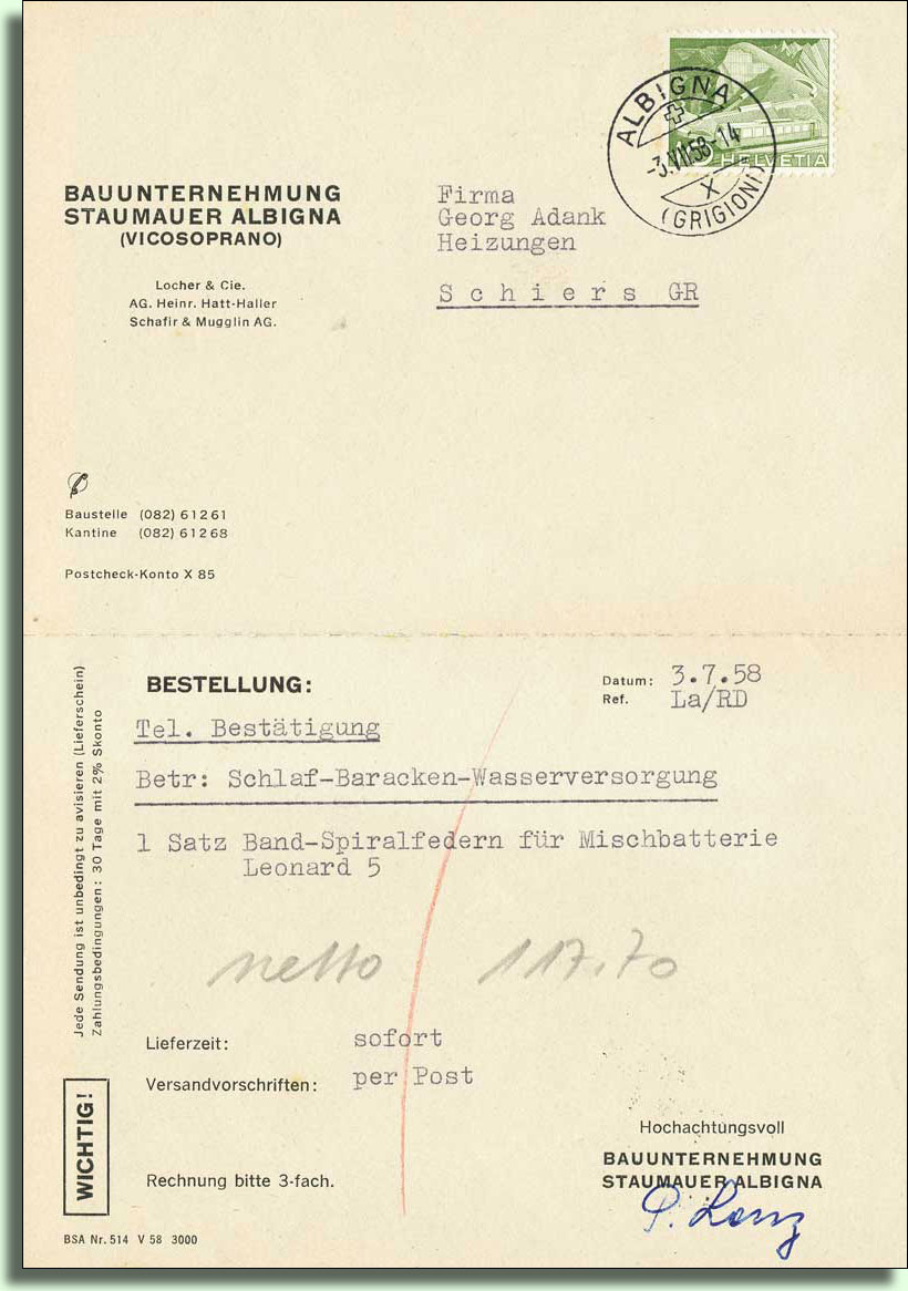 Poststelle während des Baus der Staumauer Albigna.