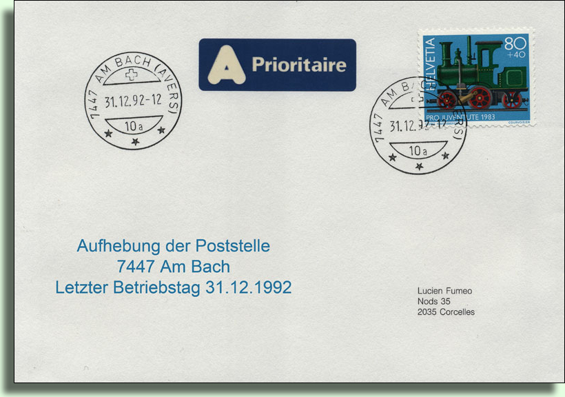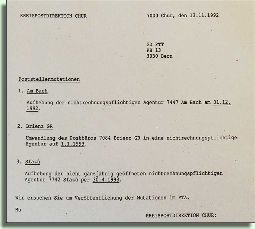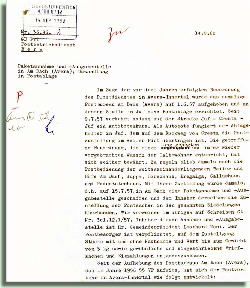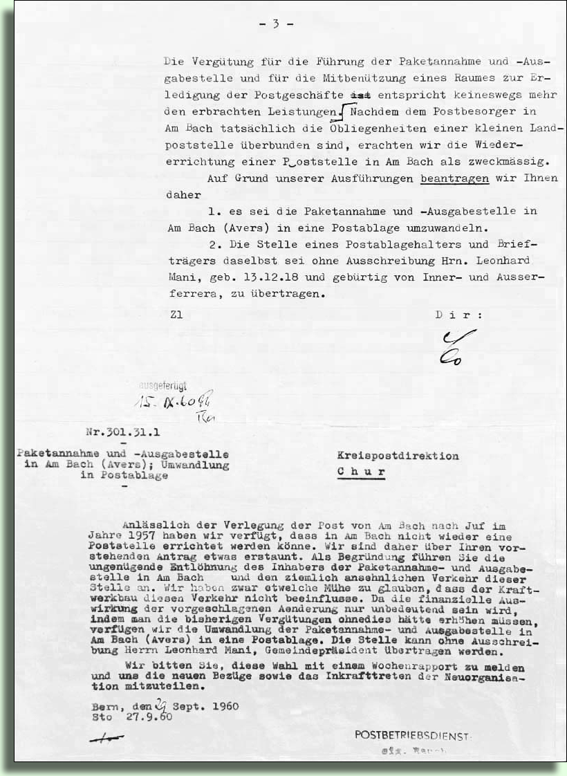 1957 wollte die Kreispostdirektion die Postablage Am Bach aufheben und gleichzeitig in Juf eine Poststelle eröffnen. Nach Protesten der Talbewohner wurde dann wenigstens eine Paketannahmestelle belassen.